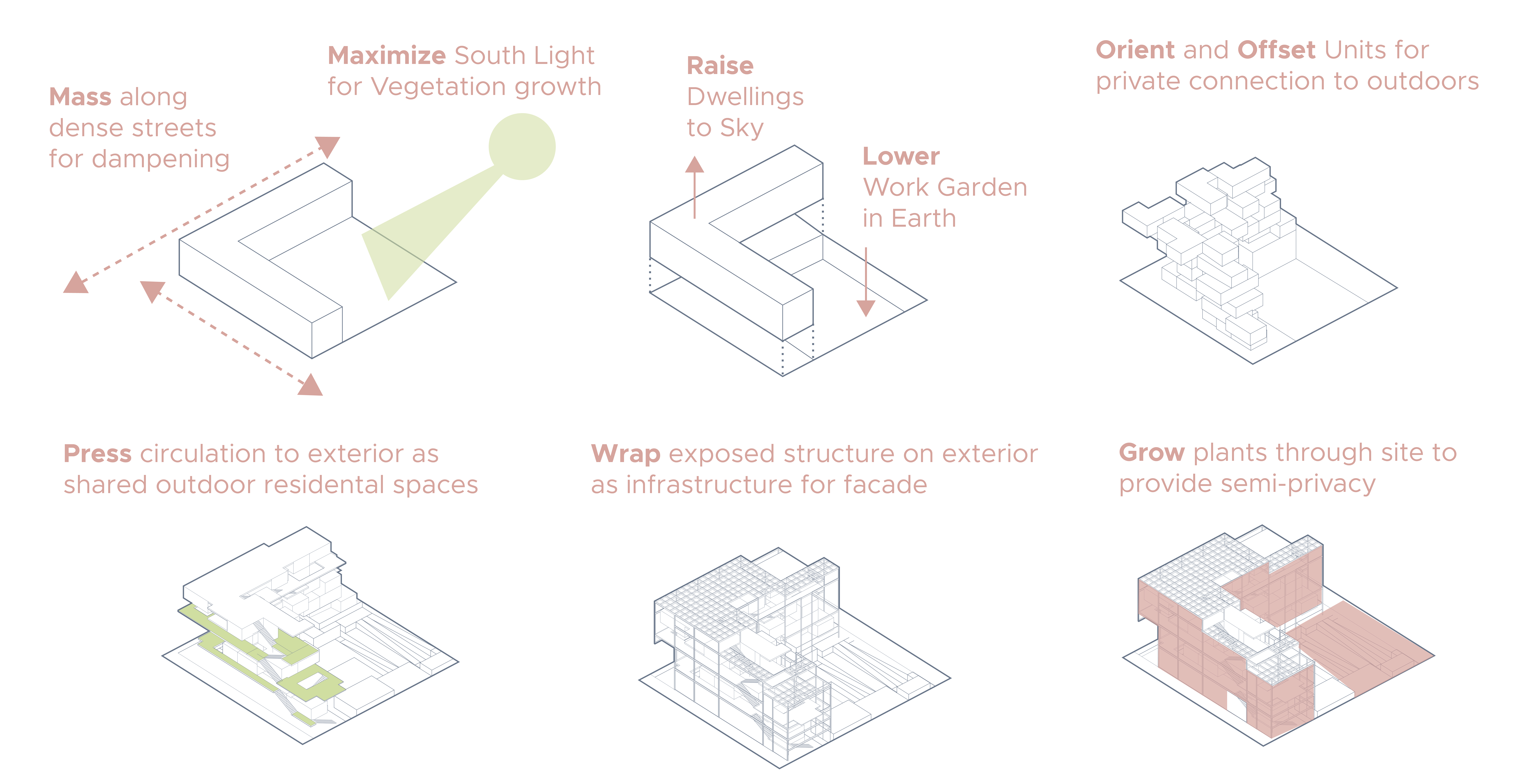 Temporary Housing in Richmond, VAStudio project designing temporary faculty housing for the University of Richmond and VCU. Located along Broad Street in the urbanity of Richmond sets up a moment to step back and have a site dedicated to promoting creativity and mental well-being. This is done through incorporating vegetation at all scales of the project; from a façade material, to incorporated systems, and through an extension of the surrounding community. The project also promotes incorporating new semi-private spaces through its spatial organization. The dwelling units are raised to the sky to provide privacy with a public working garden of art and nature is pressed into the ground for comfort. This duet of air and sky lays the roots for a social growth through the universities and community on a more equitable and sustainable way of life.